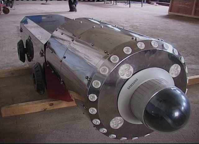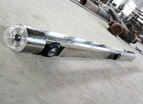 管道內(nèi)觀察機(jī)是一臺機(jī)、電、訊、光一體化的自動觀察作業(yè)小車,包括攝像觀察機(jī)頭和機(jī)身兩大部分。機(jī)頭分為旋轉(zhuǎn)和固定兩部分。機(jī)身包括變徑調(diào)節(jié)機(jī)構(gòu)、機(jī)載收發(fā)信號系統(tǒng)、機(jī)載控制系統(tǒng)、蓄電池組和驅(qū)動行走機(jī)構(gòu)。機(jī)頭旋轉(zhuǎn)部分內(nèi)裝攝像機(jī)和云臺,由電機(jī)帶動可向右擺動90度。機(jī)頭固定部分內(nèi)裝電機(jī)及傳動機(jī)構(gòu),能帶動機(jī)頭旋轉(zhuǎn)部分轉(zhuǎn)動360度。機(jī)身前端通過燕尾式插槽、插板與機(jī)頭連接成一體。變徑調(diào)節(jié)機(jī)構(gòu)采用燕尾滑板、滑道結(jié)構(gòu),用絲杠、絲母調(diào)節(jié)機(jī)頭上、下移動處于管道中心。驅(qū)動行走機(jī)構(gòu)在機(jī)身后部,其余在機(jī)身前部和中部。主要用來觀察管道焊縫內(nèi)表面缺陷和管內(nèi)有無異物及施工質(zhì)量有無問題,以便及時處理。