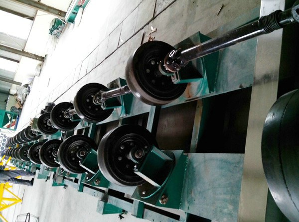 傳動(dòng)線(xiàn)解決中大型管道進(jìn)行內(nèi)、外防腐作業(yè)時(shí)管子的進(jìn)給問(wèn)題。它包括主動(dòng)輪組件、從動(dòng)輪組件、回轉(zhuǎn)盤(pán)、滑座、中心距調(diào)節(jié)機(jī)構(gòu)、中心距鎖止機(jī)構(gòu)、螺旋角調(diào)節(jié)機(jī)構(gòu)和螺旋角鎖止機(jī)構(gòu),所述主動(dòng)輪組件和從動(dòng)輪組件分別固定在對(duì)應(yīng)的回轉(zhuǎn)盤(pán)上,所述回轉(zhuǎn)盤(pán)安裝在滑座上,所述滑座與中心距調(diào)節(jié)機(jī)構(gòu)及中心距鎖止機(jī)構(gòu)配裝,所述螺旋角調(diào)節(jié)機(jī)構(gòu)與回轉(zhuǎn)盤(pán)配裝,所述螺旋角鎖止機(jī)構(gòu)安裝在滑座上,它與螺旋角調(diào)節(jié)機(jī)構(gòu)匹配。本實(shí)用新型不僅可降低操作人員的勞動(dòng)強(qiáng)度、提高工作效率,而且能保證管道螺旋傳動(dòng)線(xiàn)上各輪組之間參數(shù)的一致性。