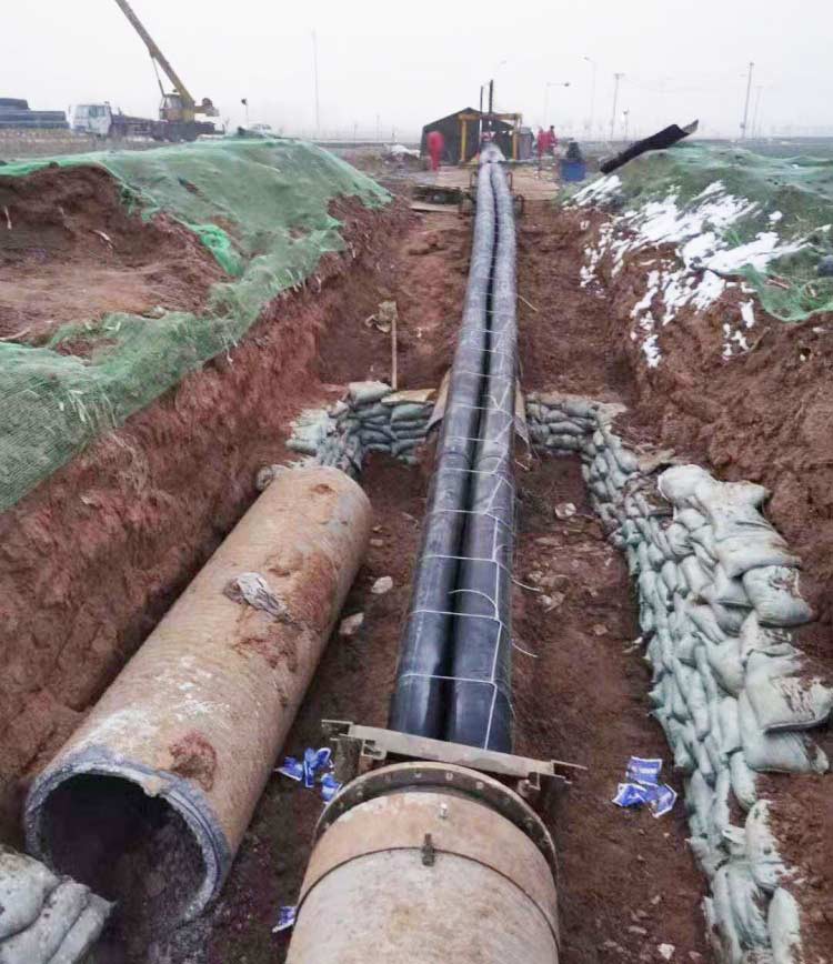 管U型內(nèi)襯修復(fù)是將外徑等于或略小于待修復(fù)管道內(nèi)徑的HDPE襯管,通過(guò)專用U形壓縮設(shè)備壓縮變形后,使襯管截面縮小至原管道截面的40-60%。在牽引力的作用下拖到待修復(fù)管道內(nèi)部。襯管到位后,用空氣壓縮機(jī)向PE管內(nèi)部進(jìn)行打壓,PE管在壓力的作用下恢復(fù)成圓形,與外管道內(nèi)壁貼合,形成復(fù)合管。